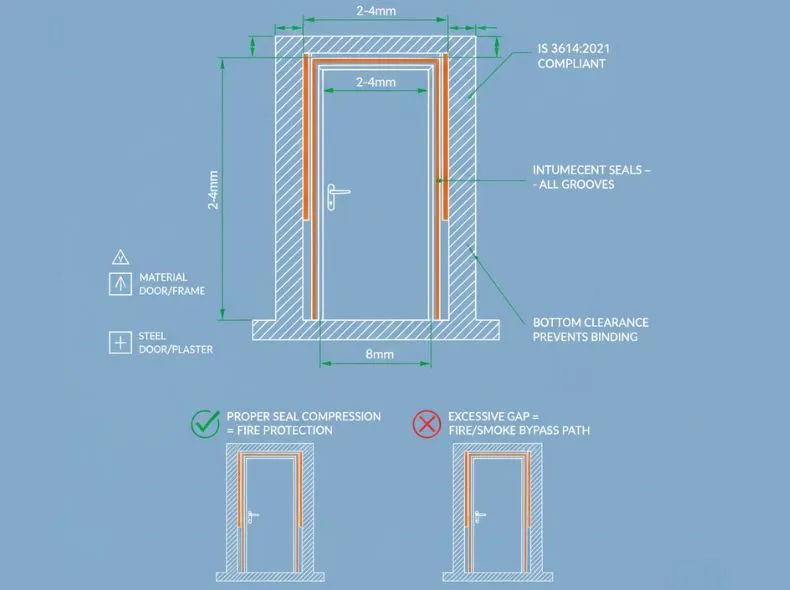 Fire-rated doors demand precision installation. According to India’s National Building Code (NBC) 2016 and IS 3614:2021 standards, specific gap requirements must be maintained: