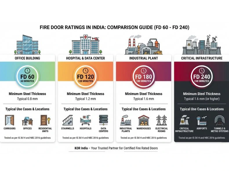 The National Building Code 2016 provides the legal framework for fire safety in Indian buildings. This code mandates fire-rated doors in specific applications and specifies their placement, ratings, and operational requirements.