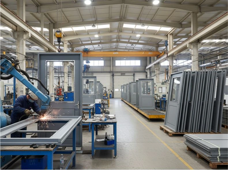 Industrial Steel Doors – Manufactured to withstand intensive daily use in factories and warehouses, these doors maintain durability and security under demanding conditions.